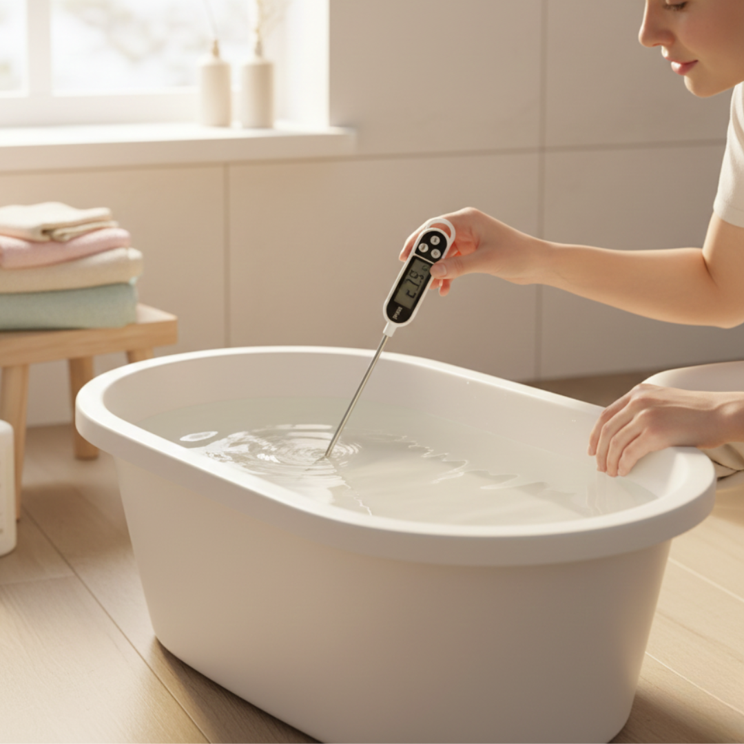 O termômetro criado especialmente para mães que querem certeza absoluta de que a água do banho, o leite e a comida do bebê estão na temperatura ideal — sem risco, sem adivinhação e sem medo de queimaduras.